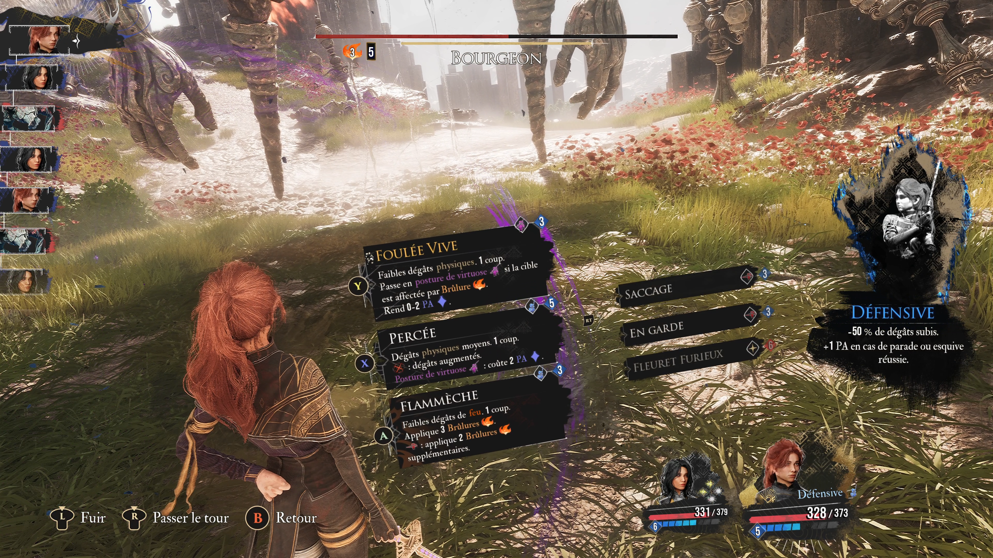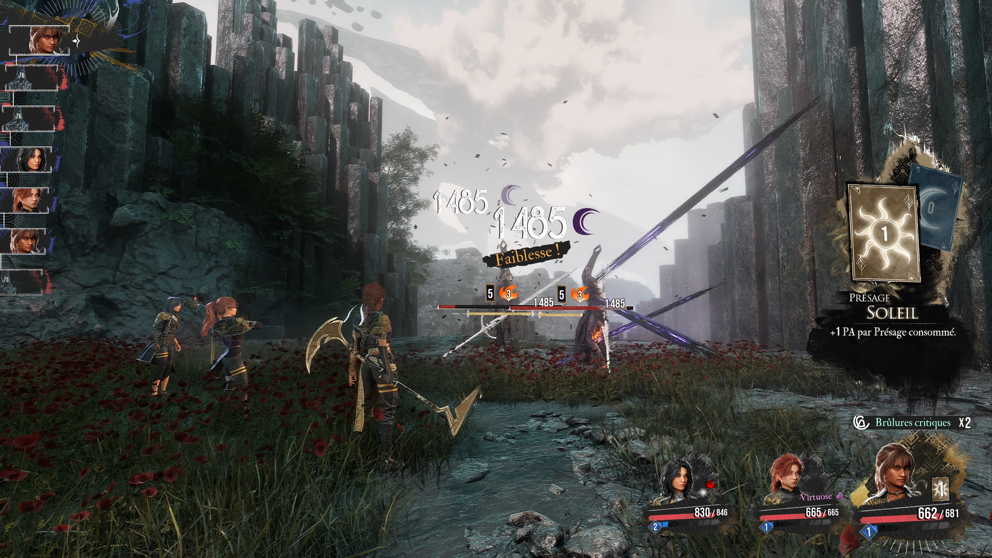 La synergie est évidente : Lune crame les ennemis, Sciel et Maëlle capitalisent dessus. Les meilleures capacités des trois personnages encouragent ce style de jeu ; c'est simple, ça fonctionne. Gustave, lui, ne bénéficie pas vraiment des brûlures, à part une attaque qui le soigne quand il tape un ennemi qui brûle (et oui, oui, "brûlures critiques", je sais).