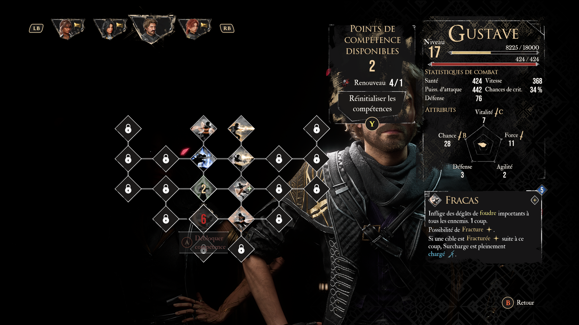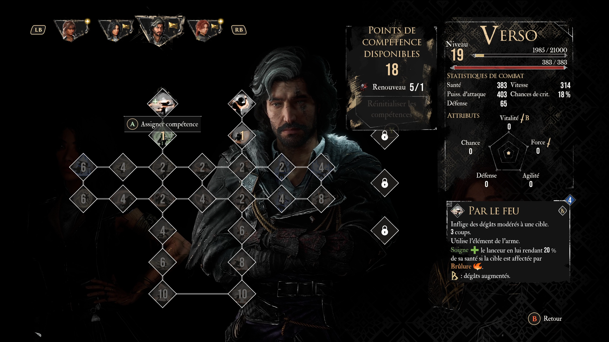 Les autres personnages, à l'inverse, voient leurs arbres de compétences respectifs s'ouvrir très rapidement ; à la fin de l'acte I, il est quasiment possible d'avoir un aperçu de toutes les capacités qu'ils pourront débloquer d'ici à la fin du jeu, et de planifier ses builds en conséquence. Par ailleurs, tous sauf Gustave disposent de 3 compétences verrouillées séparées du reste de l'arbre - on imagine des attaques spéciales qui seront débloquées plus loin dans l'histoire. Un joueur attentif peut voir venir le truc.