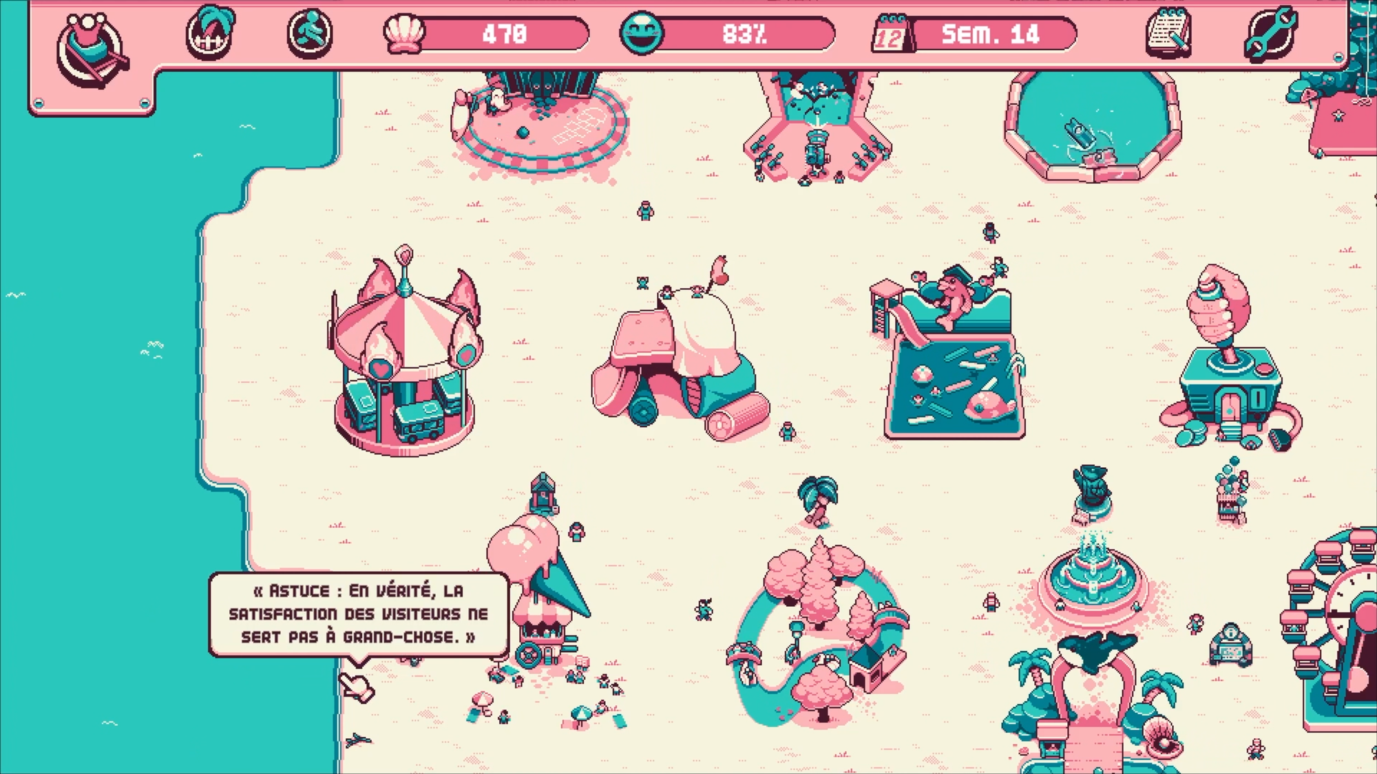 Wednesdays s'ouvre par une mise en abyme. Tim, un personnage à la tête carrée, allume son ordinateur, et vous plonge tous les deux dans un petit jeu de gestion rose et cyan : Orco Park.