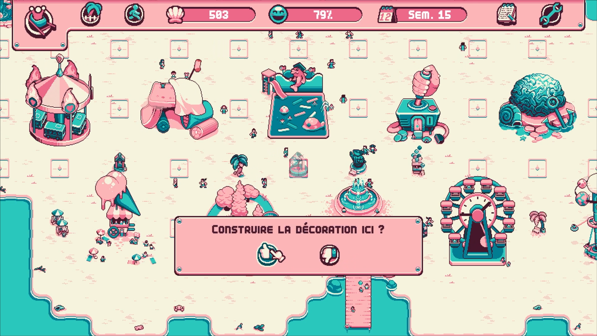 Ce qui est doublement malin, c'est la manière dont le parc permet un contrôle du rythme et de la tension. Le jeu - et c'est normal vu le propos - fait très attention à fournir des avertissements de contenu. Avant de construire une attraction, des petits pictos nous préviennent : l'échelle va de "?" quand le souvenir associé est relativement anodin, à "!!!" quand il est très cru.