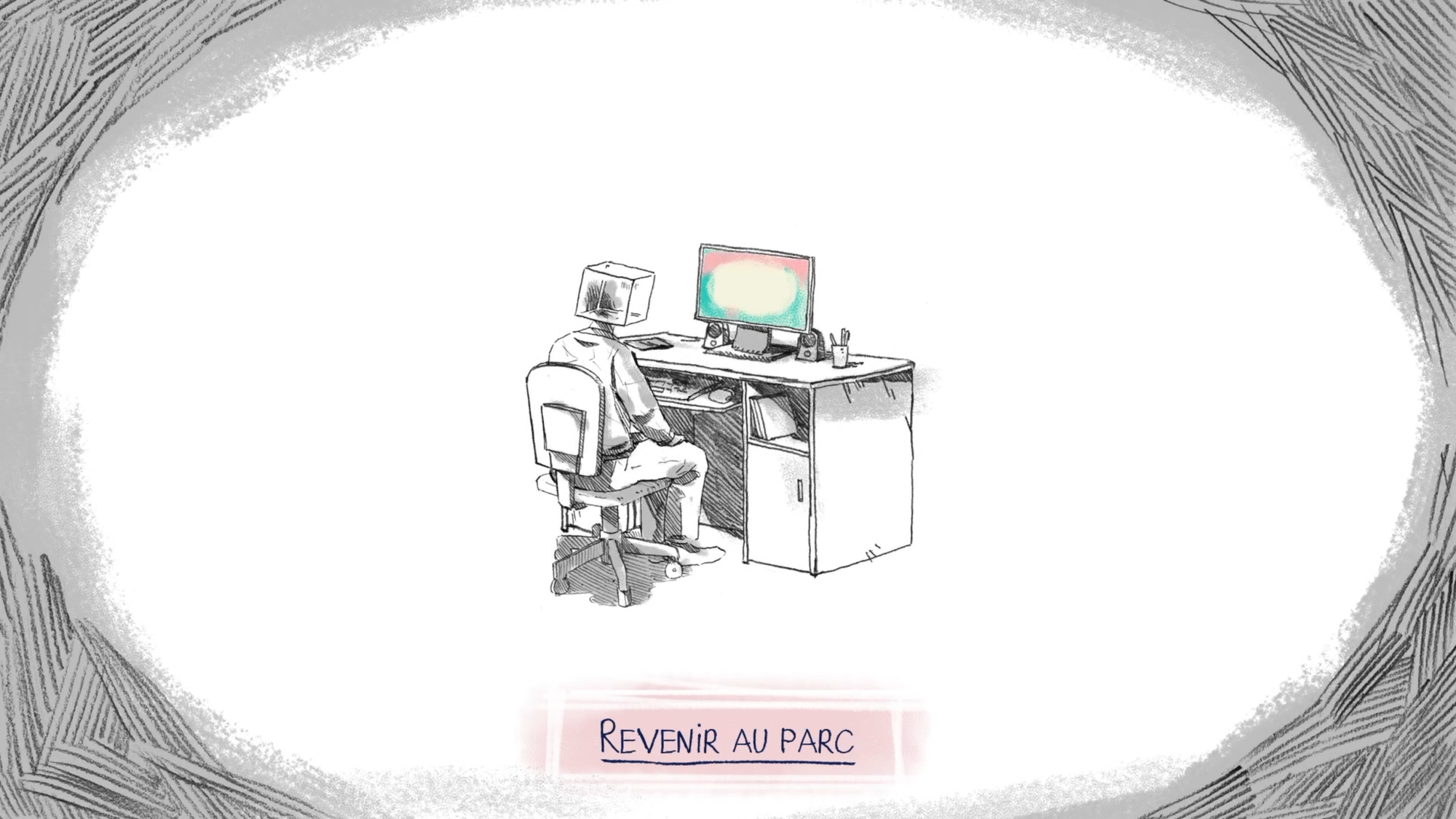 Dans ces phases de souvenirs, Wednesdays nous sort d'Orco Park et de son pixel art choupinou et devient un jeu narratif crayonné ; on y fait des choix de dialogue, qui permettent d'explorer ces tranches de vie désordonnées. À la fin du souvenir, on revient au parc, et la boucle recommence.