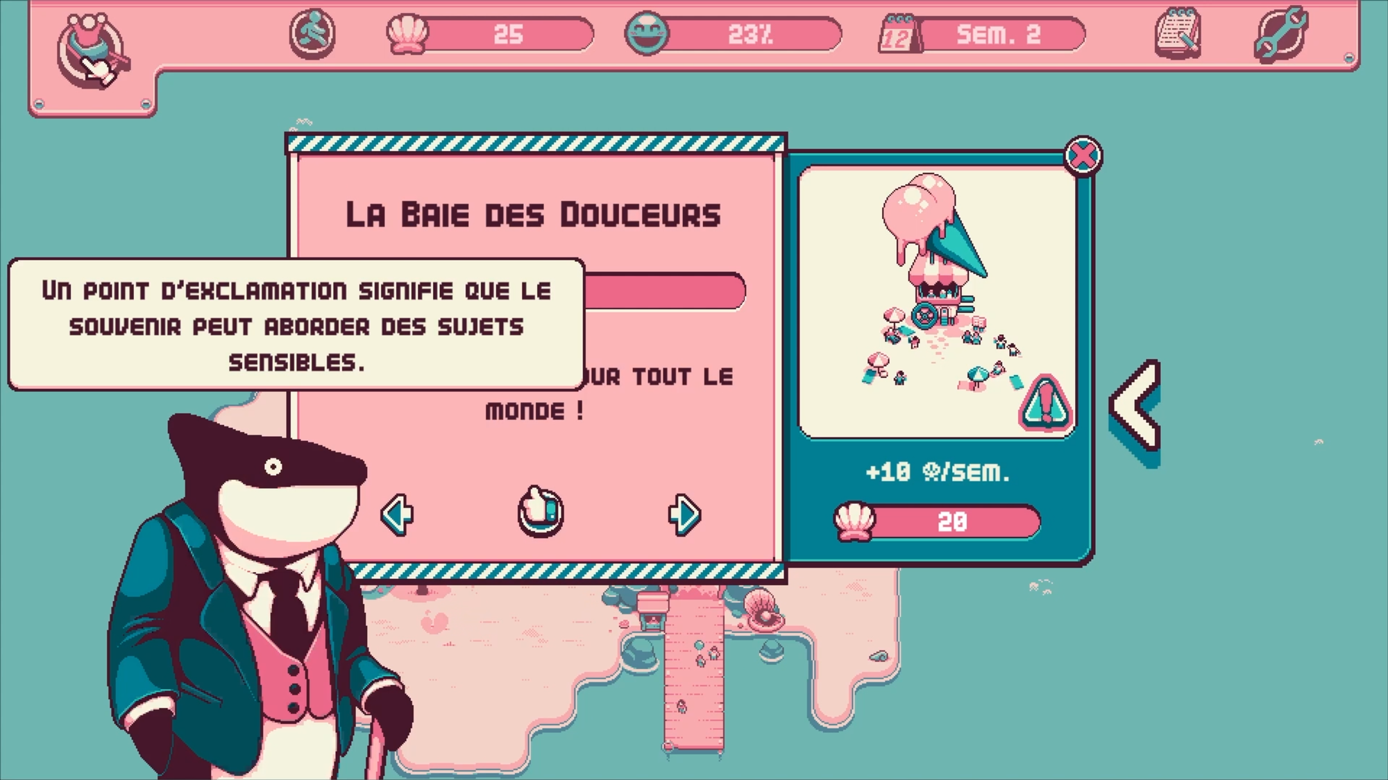Qui plus est, le jeu fournit des petites distractions optionnelles pour nous occuper les mains : quand on revient au parc, on a des déchets à nettoyer, des coquillages à ramasser, des chtis bonshommes sur lesquels cliquer. C'est l'équivalent virtuel d'un papier bulle, grâce auquel le parc fonctionne comme un sas de décompression. On ne passe pas directement au souvenir suivant ; à la place, on s'occupe les mains quelques minutes avec une activité facile mais psychologiquement satisfaisante, le temps de digérer ce que l'on vient de voir.